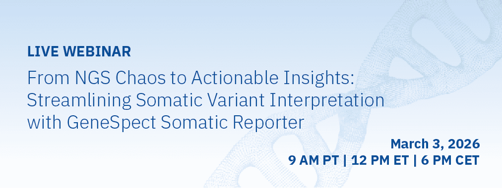 Join our upcoming live webinar From NGS Chaos to Actionable Insights: Streamlining Somatic Variant Interpretation with GeneSpect Somatic Reporter, to see how GeneSpect Somatic Reporter helps streamline somatic variant interpretation by transforming complex NGS data into clear, standardized, and clinically actionable insights. During the session, we will demonstrate how automated evidence aggregation, AMP/ACMG-aligned classification, and intelligent reporting support consistent and efficient clinical workflows.